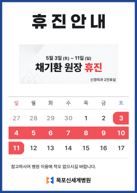 신경외과 채기환 원장 5월 휴진 안내목포신세계병원 · Apr 14, 2025 안녕하세요. 목포신세계병원입니다. 5월 3일 (토) ~ 11일 (일) 신경외과 채기환 원장 휴진입니다. 참고하셔서 내원에 차질 없으시길 바랍니다. 감사합니다.