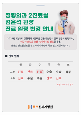 2024년 9월부터 정형외과 2진료실 김윤석 원장의 진료 일정이 변경되어, 매주 수요일은 오전 10시까지만 진료 합니다.