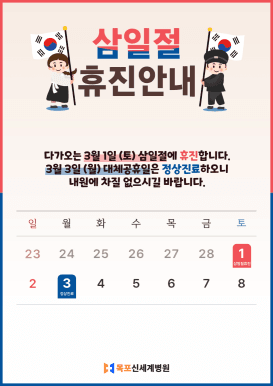 2025년 삼일절 휴진 안내목포신세계병원 · 2025년 2월 17일 안녕하세요. 목포신세계병원입니다. 다가오는 3월 1일 (토) 삼일절에 휴진합니다. 3월 3일 (월) 대체공휴일은 정상진료하오니참고하시어 내원에 착오 없으시길 바랍니다. 감사합니다.